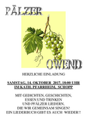 Die Kirchengemeinde Schopp lädt am Samstag, 14. Oktober 2017 ab 18 Uhr ins Pfarrheim Schopp ein.