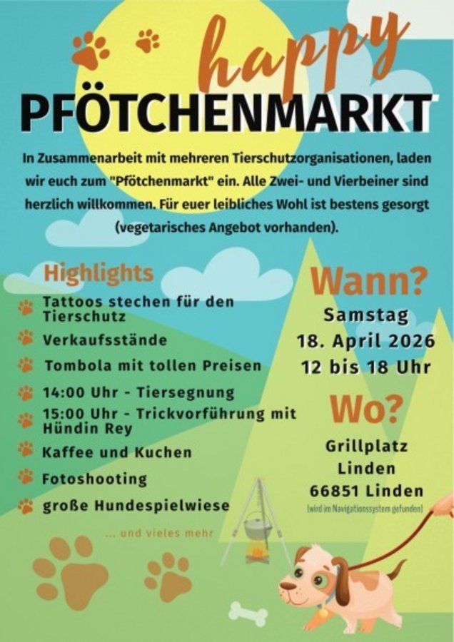 Verschiedene Tierschutzorganisationen und private Initiativen laden ein zum „Pfötchenmarkt“ am Samstag, 18.04.2026, 12 - 18 Uhr auf den Grillplatz in Linden. Geboten wird ein buntes Programm für Zwei- und Vierbeiner. Im fröhlichen Miteinander kommt die Wertschätzung für Gottes gute Schöpfung zum Ausdruck. Deshalb findet auch um 14.00 Uhr eine kurze Andacht mit Segnung der Tiere durch Pfarrer Stenz statt. Die Menschen kriegen natürlich auch was davon ab! Herzliche Einladung!