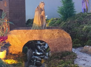 - Auf der Krippe ist eine neue Bogenbrücke zu sehen, welche von unserem Teammitglied Max Bauer angefertigt wurde. Sie führt über den Bachlauf zum Stall.
