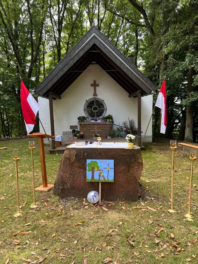 Bereits im Gottesdienst mit Pfarrer Udo Stenz, Kaplan Bernard Addagatla und seinem indischen Mitbruder auf Maria Bildeich, musikalisch unterstützt von Franz Palz auf dem Akkordeon, erläuterte Pfarrer Stenz die Bedeutung des M auf der Kugel und der beim Drehen der Kugel entstehenden Buchstaben W und griechisch Sigma und die Zahl 3. Eine kleine Kugel mit dem M am Lederarmband war das Mitgebsel für alle. Gesegnet von Kaplan Bernard und gestärkt vom Angebot des Kirchbauvereins Queidersbach machten sich 30 Pilgerinnen und Pilger aus unterschiedlichen Pfarreien der näheren und weiteren Umgebung bei bestem Wanderwetter mit dem Lied „Geh mit uns auf unserm Weg“ auf den 15 km langen Weg. Angeführt wurde die Gruppe von Messdienerinnen der Gemeinde St. Johannes der Täufer in Kirchenarnbach mit einem Schild, auf dem der Weg der Kugel mit den einzelnen Stationen abgebildet war. Am Treffpunkt in Weselberg in der Seitersstraße 27 hielt Familie Bodesohn zuverlässig wie bereits in den Vorjahren köstliche Früchte aus ihrem Garten und Wasser sowie ein stilles Örtchen für die Pilgergruppe bereit. Die nächste Etappe führte über die Höhe entlang der Fahrradstrecke und Wirtschaftswegen in Richtung Höheinöd vorbei an Feldern, Wiesen und Streuobstwiesen und eröffnete weite Blicke in die umliegende Region und herrliche Wolkenformationen. Nach Querung der Landstraße begann ein schattiger Waldpfad hinab ins Klappertal. Am Jugenddorf Sickingen wurde der Wald verlassen und über die alte Straße Burgalben und damit der letzte Anstieg nach Maria Rosenberg erreicht.