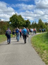 An vier Stationen, bei den Windrädern, auf der Sickinger Höhe, am Beginn und Ende des Klappertals lud Pfarrer Stenz zunächst zu gymnastischen Übungen ein, damit sich der jeweilige Buchstabe auf der Kugelarmband zeigte. In Impulsen zu M wie Maria, W wie Weg, Sigma wie Summe und 3 wie Dreifaltigkeit erläuterte er die Bedeutung für unser Leben und unseren Glaubensweg. Das Lied „Geh mit uns auf unserem Weg“ forderte jeweils zum Weitergehen, Rosenkranzgebet, miteinander Reden oder Schweigen auf.