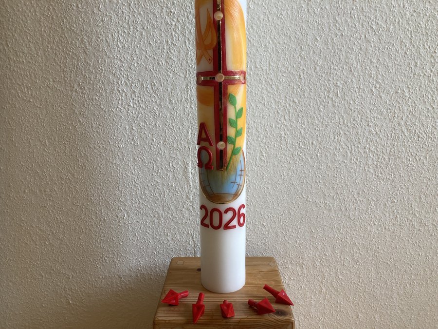 Die Osterkerzen für unsere Kirchen stehen bereit. Dieses Jahr tragen sie neben den üblichen Beschriftungen das Bild der zerbrochenen Weltkugel, aus der ein neuer Zweig hervorbricht. Die Nägel liegen noch daneben und werden zu Beginn der Feier der Osternacht in die Kerze gedrückt. Sie sind Symbole für die vielfältigen Verwundungen, an denen wir leiden. Wir dürfen sie mit hineingeben in die Verwundungen Jesu Christi und darauf vertrauen, dass er sie in die Auferstehung mit hineinträgt und immer wieder neues Leben schenkt. Die Feier der österlichen Tage möchte uns in der Hoffnung bestärken, dass es immer einen neuen Anfang gibt.